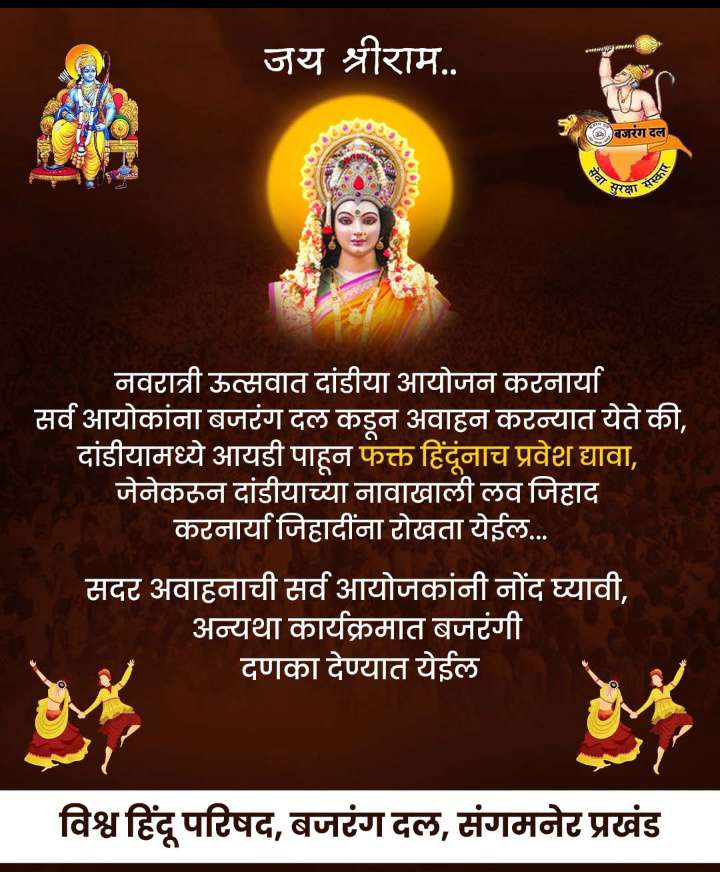 गरबा उत्सवात आयोजकांनी फक्त हिंदू धर्मियांना प्रवेश द्यावे, त्यासाठी गरबामध्ये येणाऱ्यांची आधार कार्ड तपासण्यात यावीत अशी अपेक्षा विश्व हिंदू परिषदेने व्यक्त केली आहे. गरबा हा श्रद्धेचा आणि भक्तीचा विषय असून ते फक्त नृत्य नाही, तो इव्हेंटही नाही, त्यामुळे गरबा आयोजनाच्या स्थळी देवीबद्दल श्रद्धा नसलेल्या, भक्ती नसलेल्यानी प्रवेशच करू नये. तिथे फक्त हिंदू धर्मियांनी प्रवेश करावे असे मत विश्व हिंदू परिषद बजरंग दलाचे संगमनेर प्रखंड संयोजक कुलदीप ठाकूर यांनी व्यक्त केले आहे.