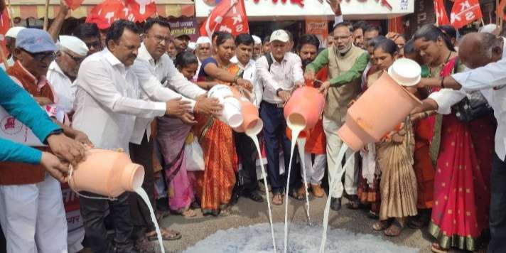 अडचणीत सापडलेल्या शेतकऱ्यांना मदत व्हावी यासाठी सरकारने दूध दर प्रश्नी हस्तक्षेप करावा या मागणीसाठी राज्यभर शेतकऱ्यांनी तीव्र आंदोलने सुरू आहेत. या पार्श्वभूमीवर संगमनेरमध्ये देखील अशाच प्रकारचे दूध ओतून आंदोलन करण्यात आले.
