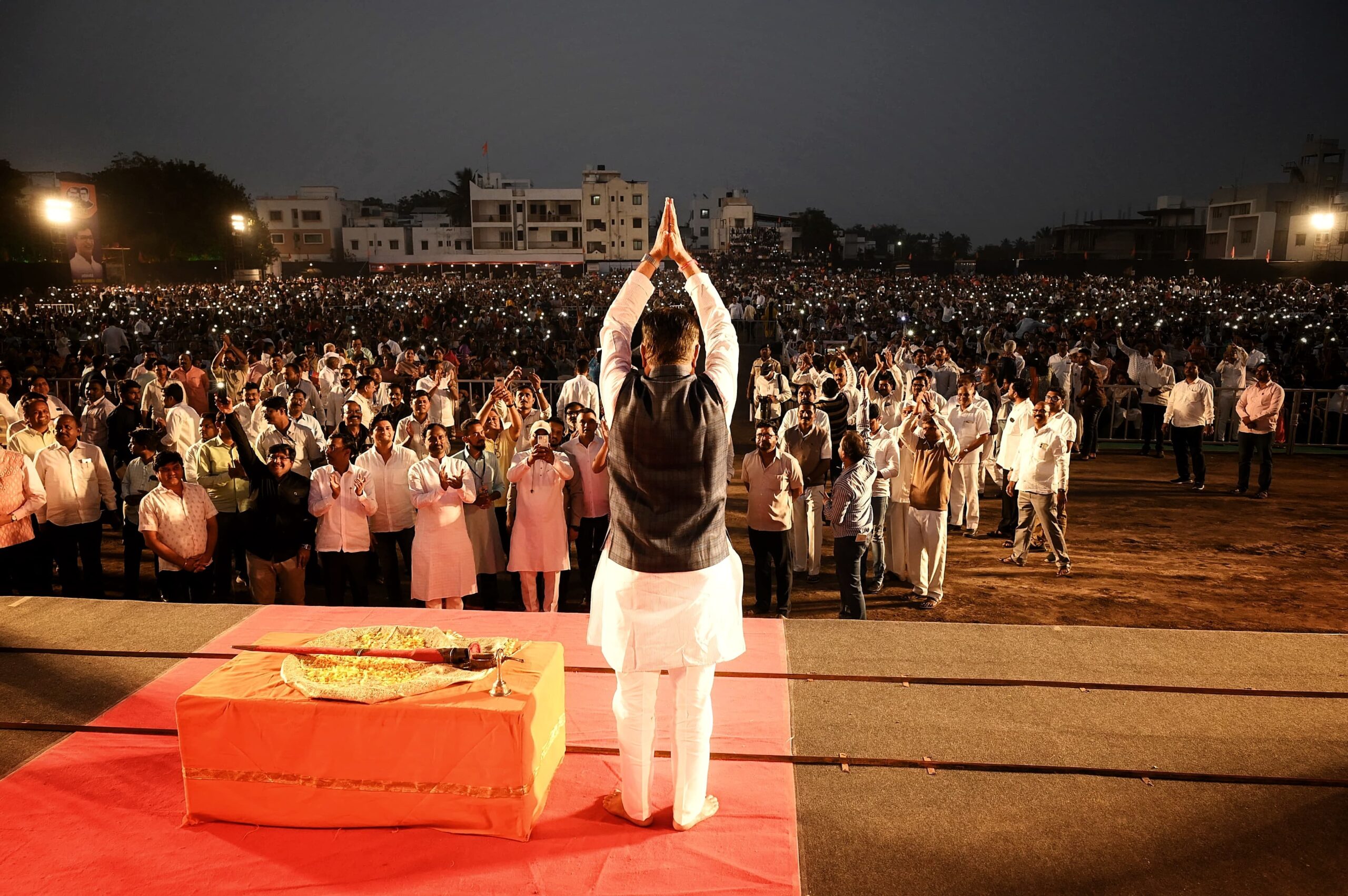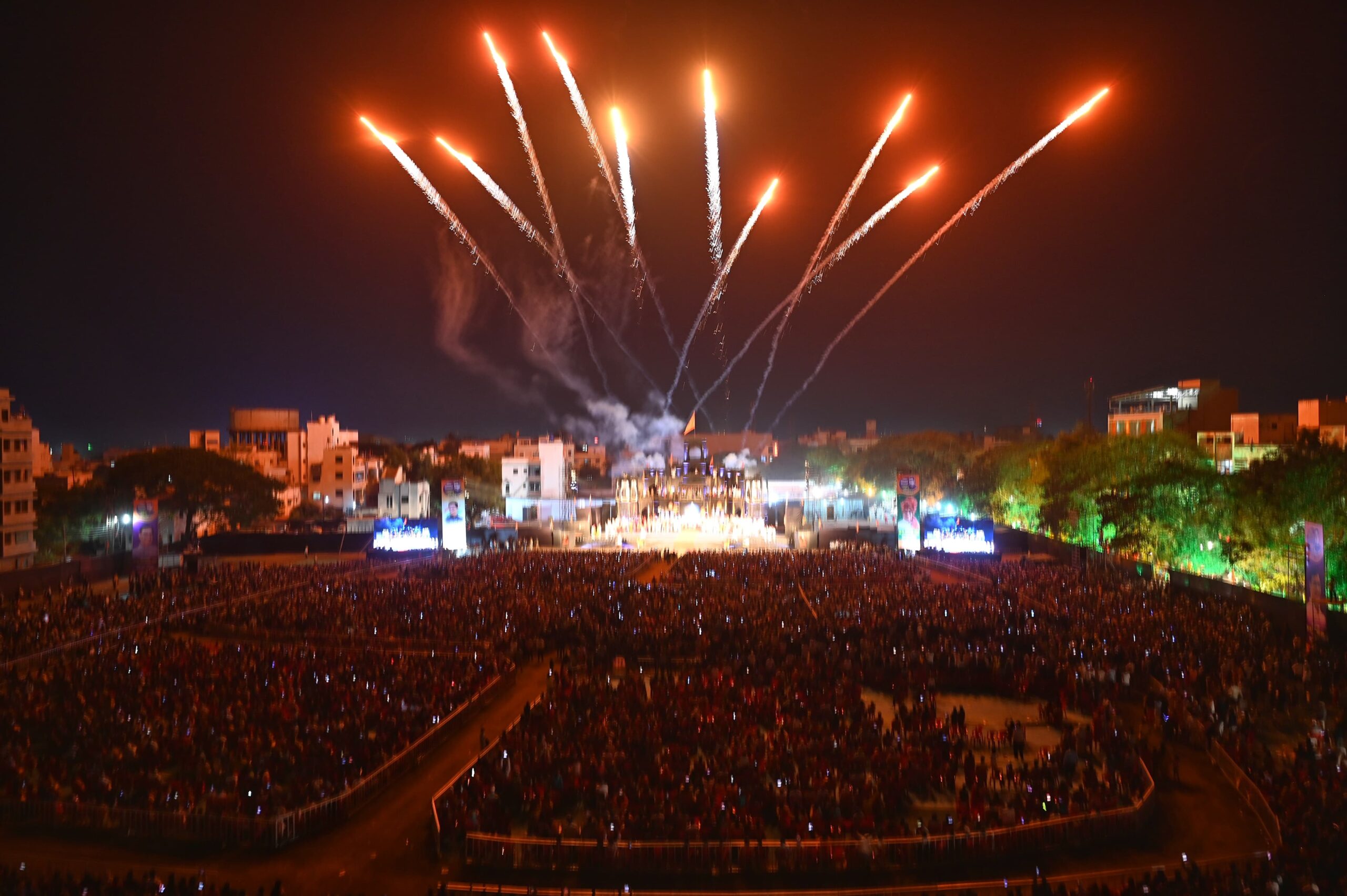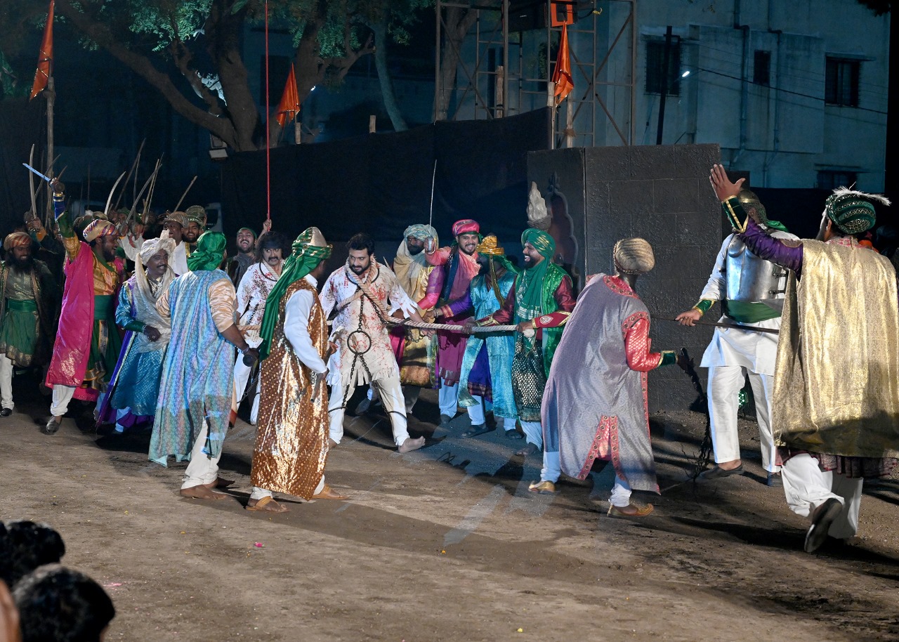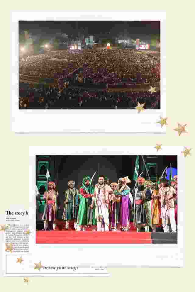 अत्यंत आकर्षक सजावट, उत्कृष्ट बैठक व्यवस्था, भव्य पार्किंग आणि ५० हजारावर नागरिकांच्या उपस्थितीत शाहिरी डफाने व आतिषबाजीने चार दिवस चालणाऱ्या महानाट्याला सुरुवात झाली.