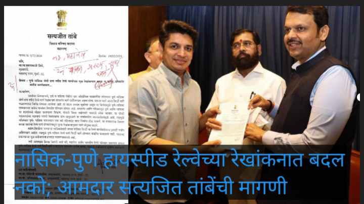 मुंबई :- नासिक-पुणे हायस्पीड रेल्वे मार्गाच्या रेखांकनात मोठ्या प्रमाणात बदल करण्यात आले असून यामुळे या मार्गाच्या अंतरात देखील मोठी वाढ होणार आहे. संगमनेर मार्गे जाणारी ही रेल्वे आता शिर्डीहून जाणार आहे. त्यामुळे या रेल्वे मार्गाच्या रेखांकनात कोणत्याही स्वरूपाचा बदल नको. रेल्वे मार्ग प्रस्तावित असल्याप्रमाणेच संगमनेर मधील मेला जावा अशी आग्रही मागणी नाशिक पदवीधर मतदारसंघाचे आमदार सत्यजित तांबे यांनी राज्याचे मुख्यमंत्री एकनाथ शिंदे, उपमुख्यमंत्री देवेंद्र फडणवीस यांच्याकडे निवेदनाद्वारे मंगळवारी केली.