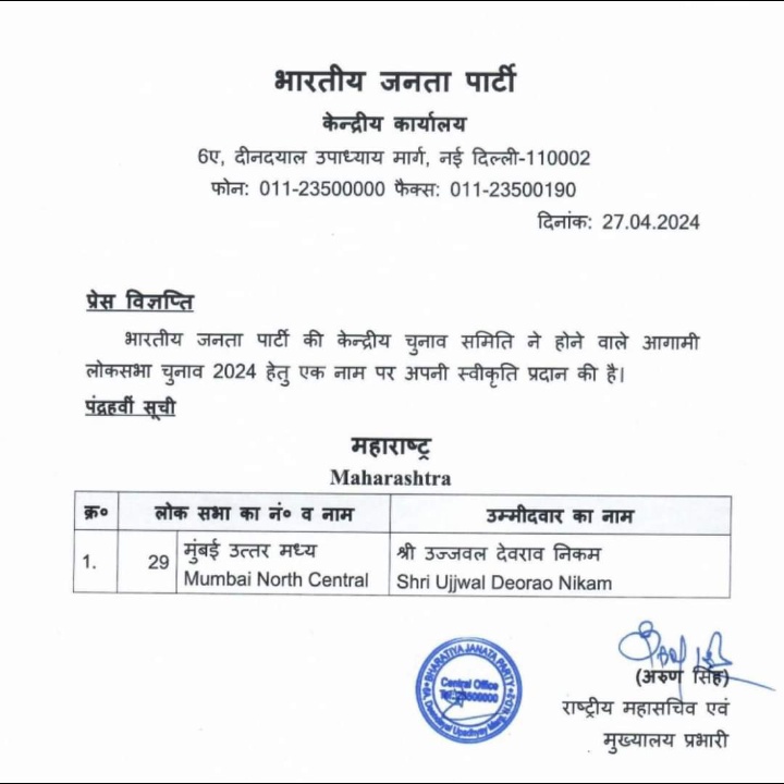 भाजपने शनिवारी उमेदवारांची पंधरावी यादी जाहीर केली. मुंबई उत्तर मध्य लोकसभा मतदारसंघातून निवडणूक लढविण्यासाठी पुनम महाजन इच्छुक होत्या. मात्र भाजपकडून महाजन यांना शेवटपर्यंत वेटिंगवर ठेवत अनपेक्षितरित्या उज्वल निकम यांची उमेदवारी जाहीर करण्यात आली आहे.