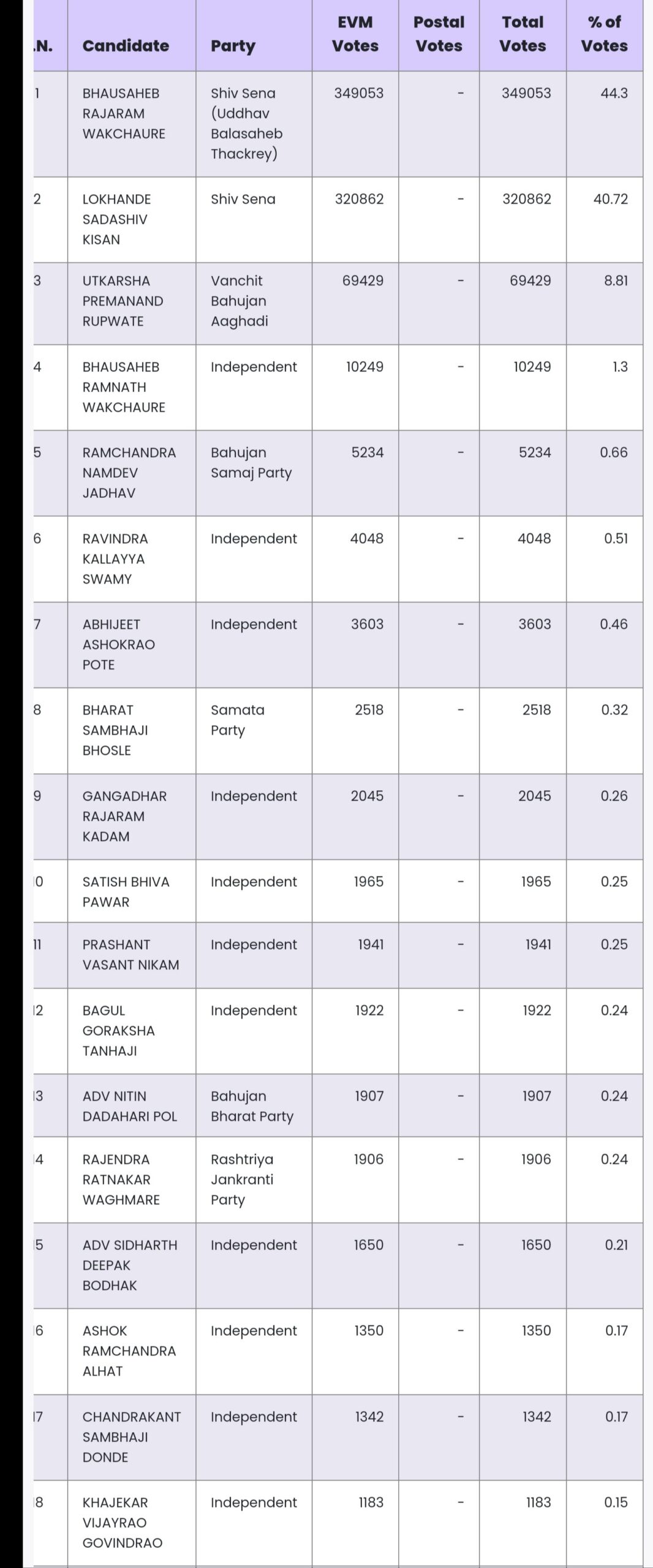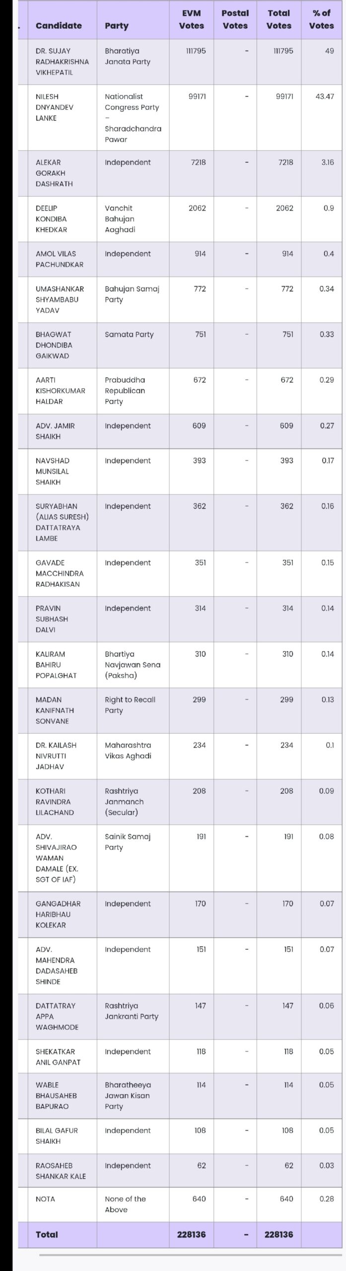 शिर्डी आणि अहमदनगर लोकसभा मतदारसंघातील उमेदवार आणि त्यांना मिळालेली मते पुढील प्रमाणे (स्त्रोत केंद्रीय निवडणूक आयोग)