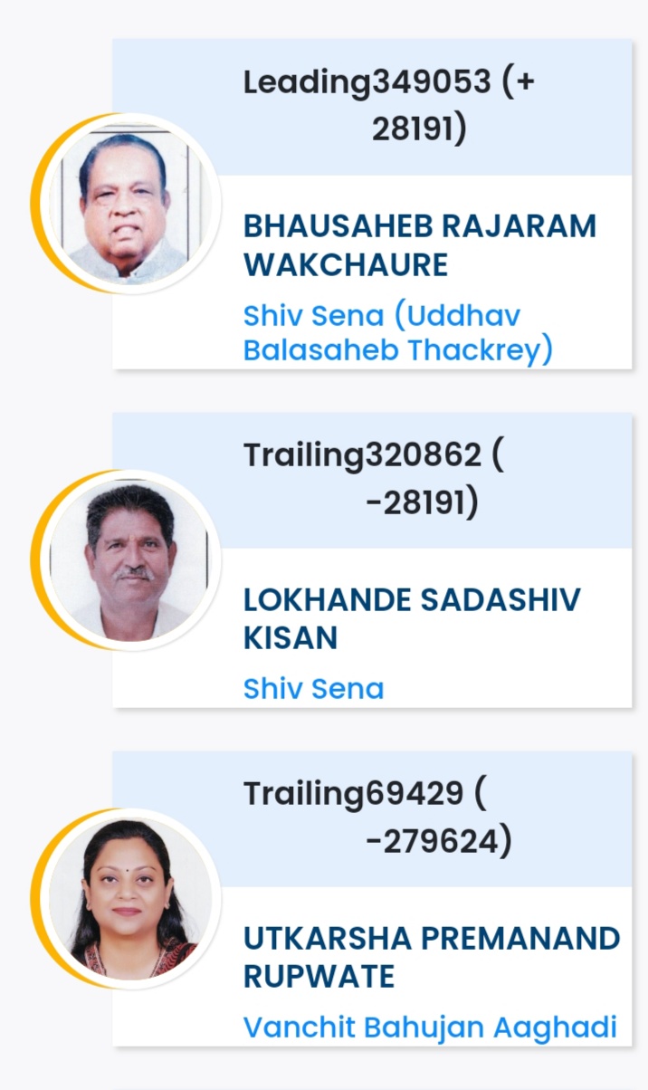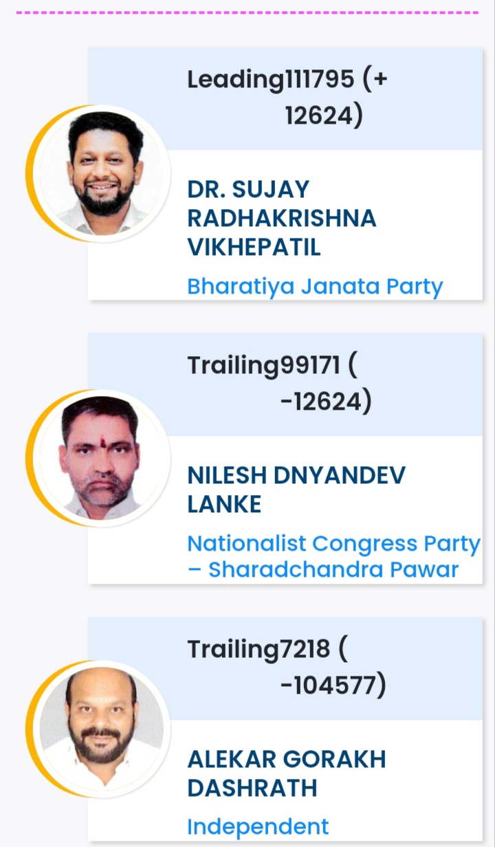 अहमदनगर मधून डॉक्टर सुजय विखे पाटील 12624 तर शिर्डीतून भाऊसाहेब वाकचौरे 28191 मतांनी आघाडीवर आहे.