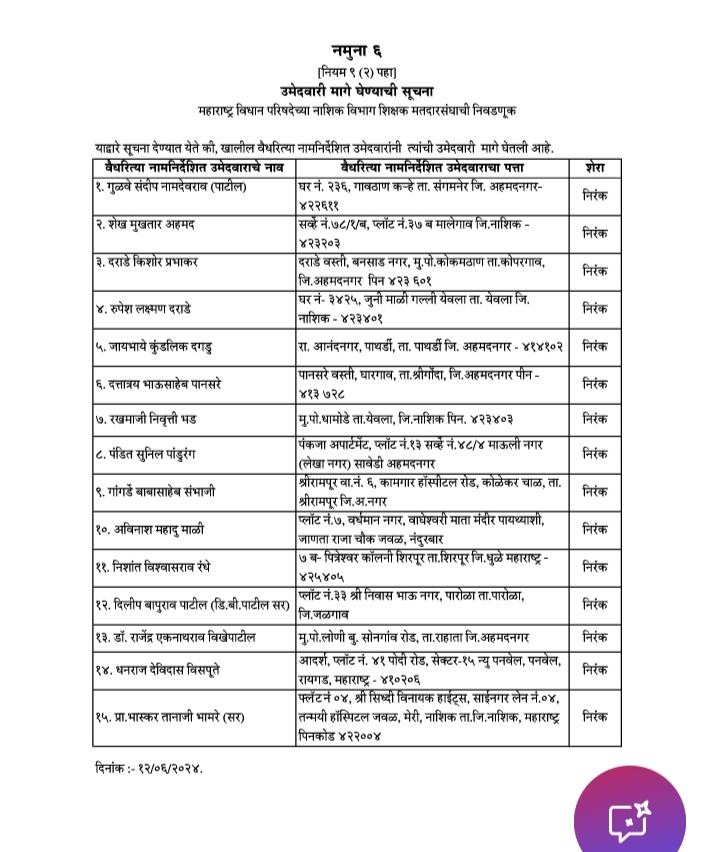 नाशिक विभाग शिक्षक मतदार संघातून उमेदवारी दाखल केलेल्यापैकी तब्बल १५ जणांनी माघार घेतली असून यात राज्याचे महसूल मंत्री राधाकृष्ण विखे पाटील यांचे बंधू डॉ. राजेंद्र विखे पाटील या दिग्गज उमेदवारासह काँग्रेसच्या उमेदवाराचा देखील समावेश आहे. त्यामुळे आता निवडणूक रिंगणात २१ उमेदवार उरले असून या मतदारसंघात तिरंगी लढतीची शक्यता वर्तवली जात आहे.
