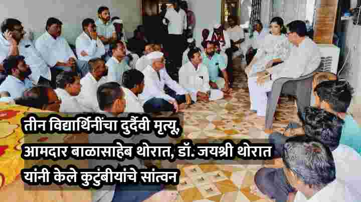 शनिवारी संगमनेर तालुक्यातील मेंढवन येथे तीन विद्यार्थिनींचा शेततळ्याच्या पाण्यात बुडून दुर्दैवी मृत्यू झाला. ही घटना अत्यंत दुर्दैवी असल्याचे स्पष्ट करत तालुक्याचे लोकप्रतिनिधी माजी मंत्री आमदार बाळासाहेब थोरात व युवक काँग्रेसचे अध्यक्ष, कॅन्सरतज्ञ डॉ. जयश्री थोरात यांनी रविवारी मृत विद्यार्थिनींच्या कुटुंबीयांची भेट घेत त्यांचे सांत्वन केले.