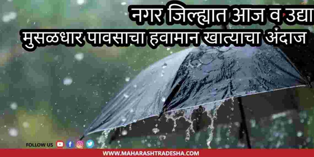 अहमदनगर जिल्ह्यात आज व उद्या (दिनांक ८, ९ जुलै) दुजांच्या कडकडाटासह वादळी वारा व अतिवृष्टीची शक्यता हवामान खात्याकडून वर्तविण्यात आली आहे. या पार्श्वभूमीवर जिल्ह्यातील नागरिकांनी काळजी घेण्याचे आवाहन जिल्हा प्रशासनामार्फत करण्यात आले आहे.