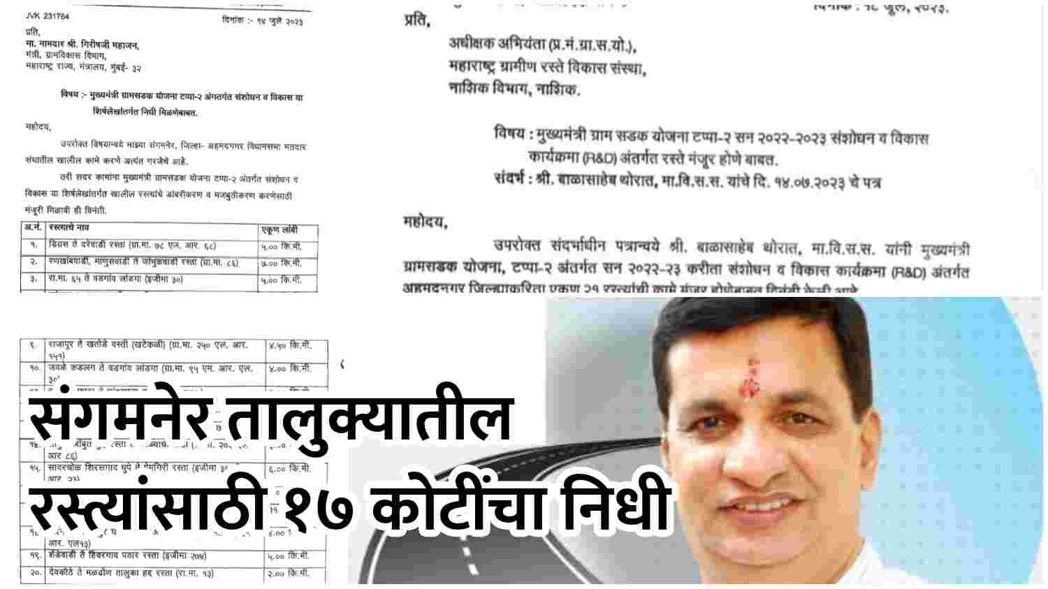 या रस्त्यांचा आहे समावेश… नव्याने आमदार थोरात यांनी तालुक्यातील विविध रस्त्यांकरता १४ जुलै २०२३ रोजी दिलेल्या पत्रानुसार मुख्यमंत्री ग्रामसडक योजना टप्पा दोन अंतर्गत डिग्रस ते दरेवाडी हा २.१० किलोमीटर लांबीच्या रस्त्याकरिता २ कोटी ४३ लाख ६७ हजार, पारेगाव बुद्रुक काकडवाडी पालखी रस्त्याकरता २ कोटी ७४ लाख २२ हजार रुपयांचा, धांदरफळ ते कारमळा या रस्त्याकरता २ कोटी ७३ लाख २२ हजार रुपये, राजापूर ते खतोडे वस्ती या रस्त्याकरता ३ कोटी ५० लाख ४८ हजार रुपये, जवळेकडलग ते वडगाव लांडगा या रस्त्याकरता ३ कोटी १५ लाख ८९ हजार रुपये, शेंडेवाडी ते हिवरगाव पठार या पठार भागातील रस्त्याकरता ३ कोटी २ लाख ४३ हजार रुपयांचा निधी मंजूर झाला आहे. एकूण सहा रस्त्यांकरता १७ कोटी ५८ लाख ९१ हजार रुपयांचा एकूण निधी मंजूर झाला आहे.