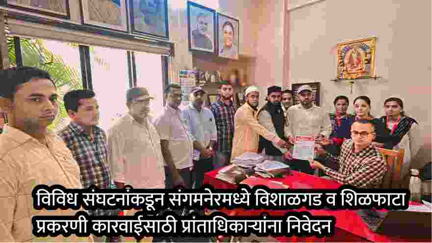 गडकिल्ल्यांच्या नावाखाली गैरप्रकारातून दोन समाजात तेढ निर्माण करणाऱ्या तसेच ठाणे जिल्ह्यातील शिळफाटा परिसरात गणेश मंदिरात आसरा घेण्यासाठी गेलेल्या महिलेवर मंदिरातील पुजाऱ्यांनी अत्याचार करत तिघा समाज विघातक आरोपींवर कारवाई करण्याच्या मागणीसाठी संगमनेरमध्ये संविधान प्रेमी भारताचे नागरिक, ह्यूमन इनोवेशन ऑर्गनायझेशन सामाजिक संस्थेच्या माध्यमातून मुस्लिम समाजासह इतर धर्मियांनी प्रांताधिकार्यांना निवेदन दिले आहे.