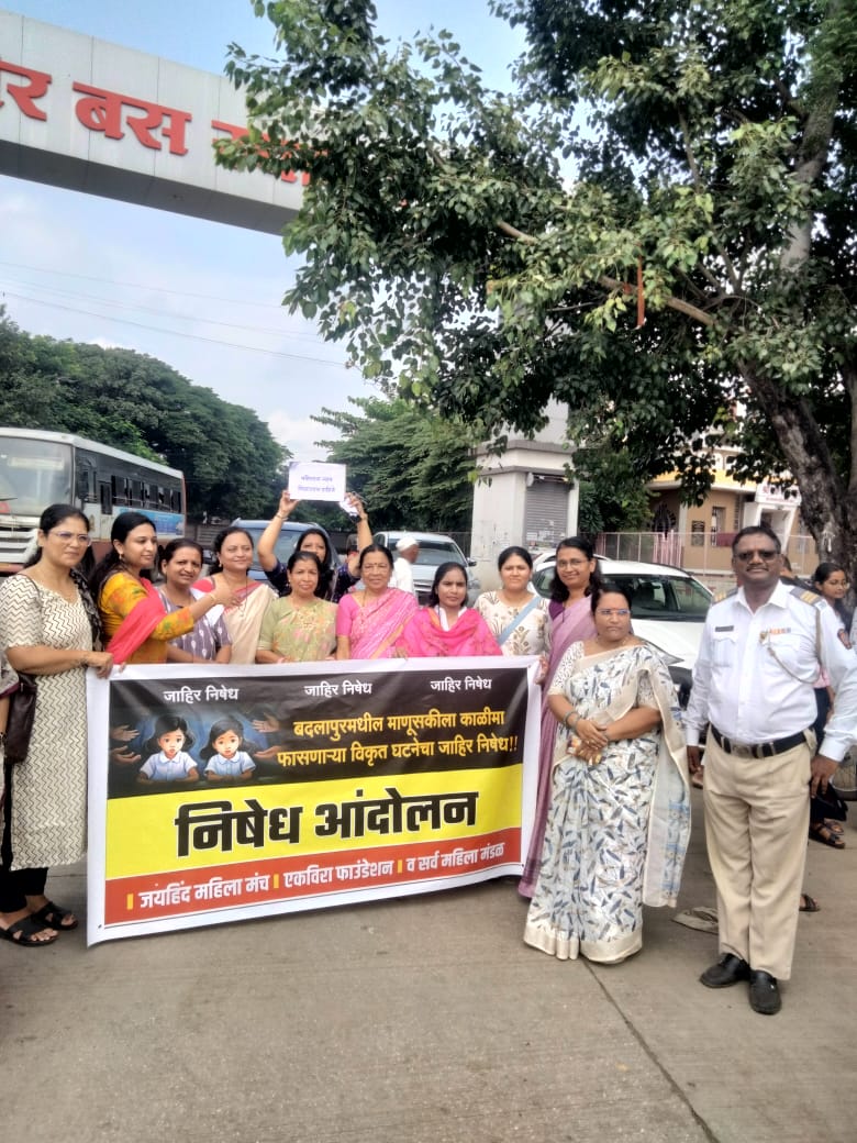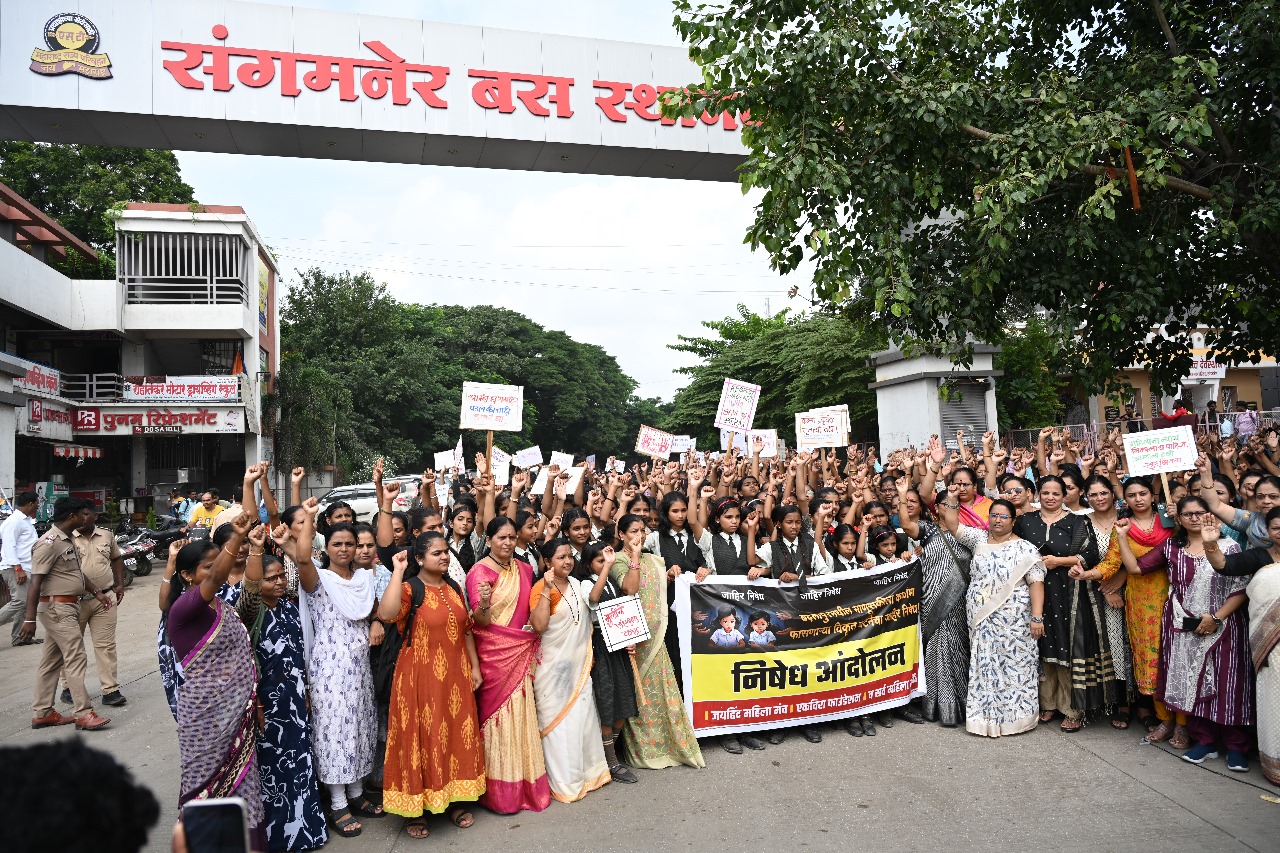 संगमनेर शहरात जयहिंद महिला मंच, एकविरा फाउंडेशन व विविध महिला संघटनांच्यावतीने भव्य निषेध मोर्चा झाला. यामध्ये दुर्गाताई तांबे, सुनीता कोडे, अर्चना बालोडे, डॉ. श्रद्धा वाणी, सुनीता कांदळकर, शितल उगलमुगले, सुरभी मोरे, मनीषा शिंदे, नम्रता पवार, अमृता राऊत, यांच्यासह ३ हजार मुली सहभागी झाल्या होत्या.