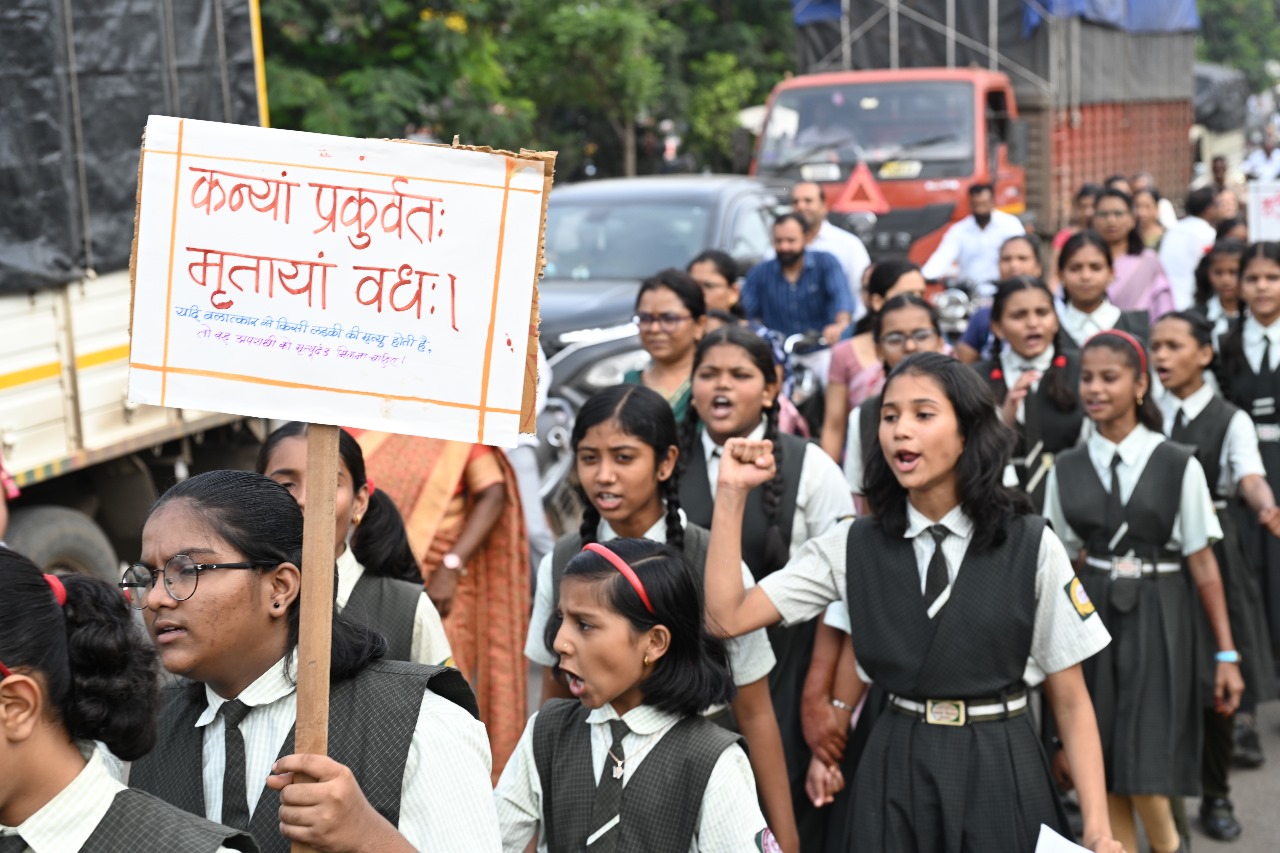 सह्याद्री विद्यालयापासून निघालेल्या या मोर्चात विद्यार्थिनींनी नवीन नगर रोड, लिंक रोड, पुणे-नाशिक हायवे ते बस स्थानक अशा निषेध मोर्चात नराधम आरोपींच्या विरोधात जोरदार घोषणाबाजी केली. फाशी द्या, फाशी द्या आरोपींना फाशी द्या. मुलगी वाचवा, देश वाचवा, फुल नही, चिंगारी है, ये भारत की नारी है, अशा घोषणा देऊन या आरोपींना तात्काळ फाशी द्या अशी मागणी केली.