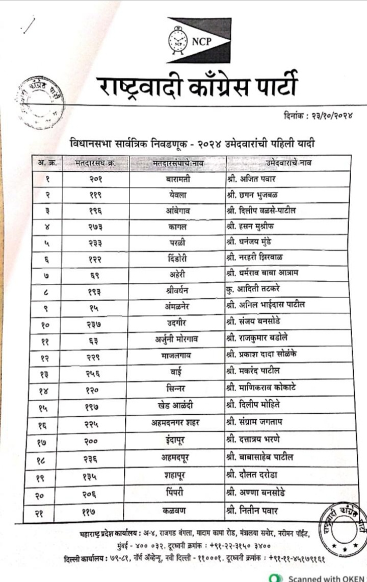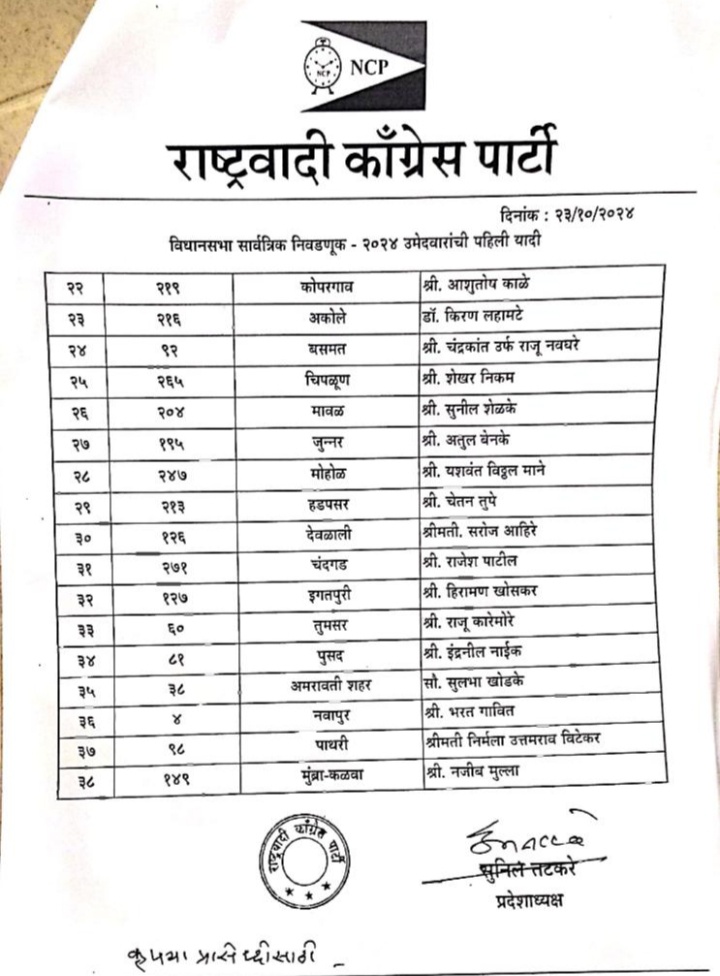राष्ट्रवादी काँग्रेसचे जाहीर करण्यात आलेले उमेदवार पुढीलप्रमाणे… बघा यादी…
