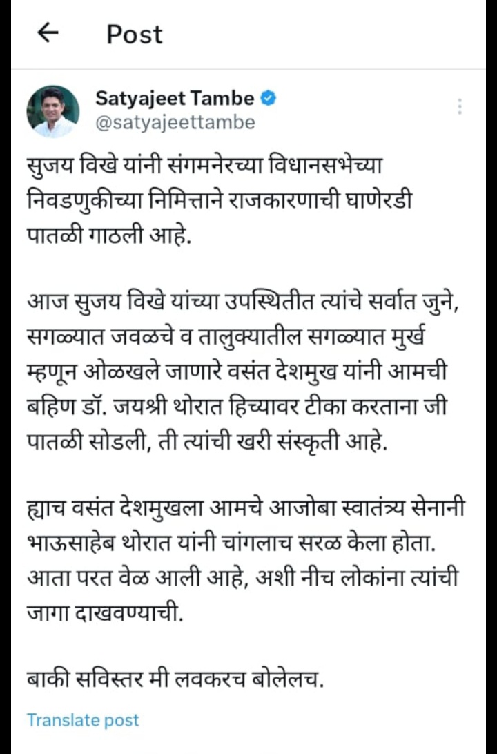 सुजय विखेंनी राजकारणाची घाणेरडी पातळी गाठली, वसंत देशमुखला भाऊसाहेब थोरात यांनी चांगलाच सरळ केला होता. आता परत वेळ आली आहे अशा नीच लोकांना त्यांची जागा दाखविण्याची – आमदार सत्यजित तांबे