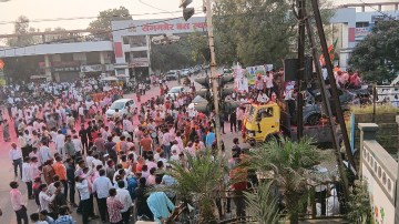 विधानसभा निवडणूक मतमोजणीनंतर उमेदवारांच्या समर्थकांनी काढलेल्या मिरवणुकीत बस स्थानक चौकात गर्दीतून वाहन चालकांना वाट काढून घेण्याच्या प्रयत्नात असलेल्या सहाय्यक पोलीस निरीक्षकाला वाहनाचा धक्का लागल्याने ते गंभीर जखमी होऊन पायाला इजा झाली आहे. जखमी पोलीस अधिकाऱ्याला उपचारासाठी रुग्णालयात हलविण्यात आले.