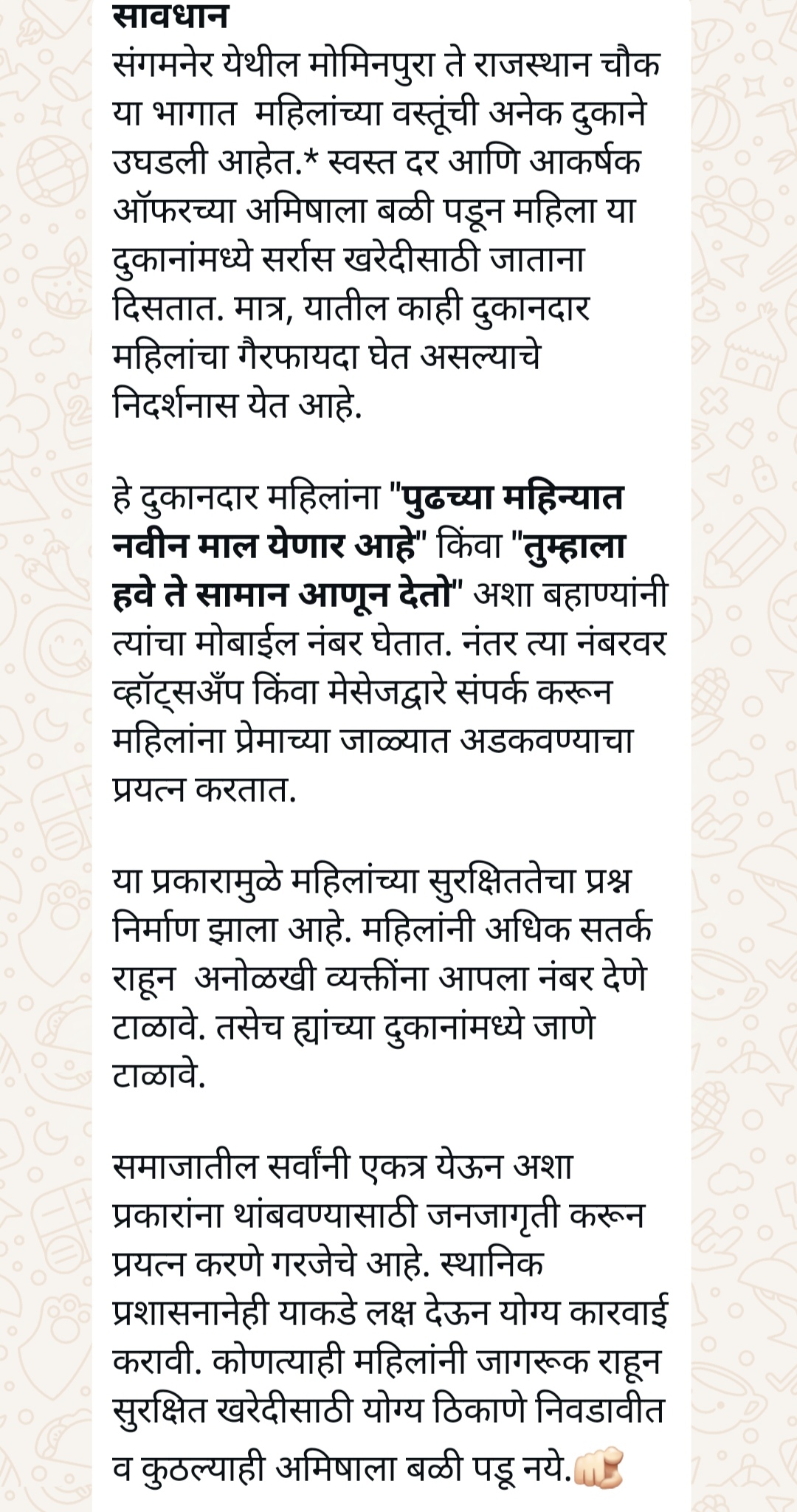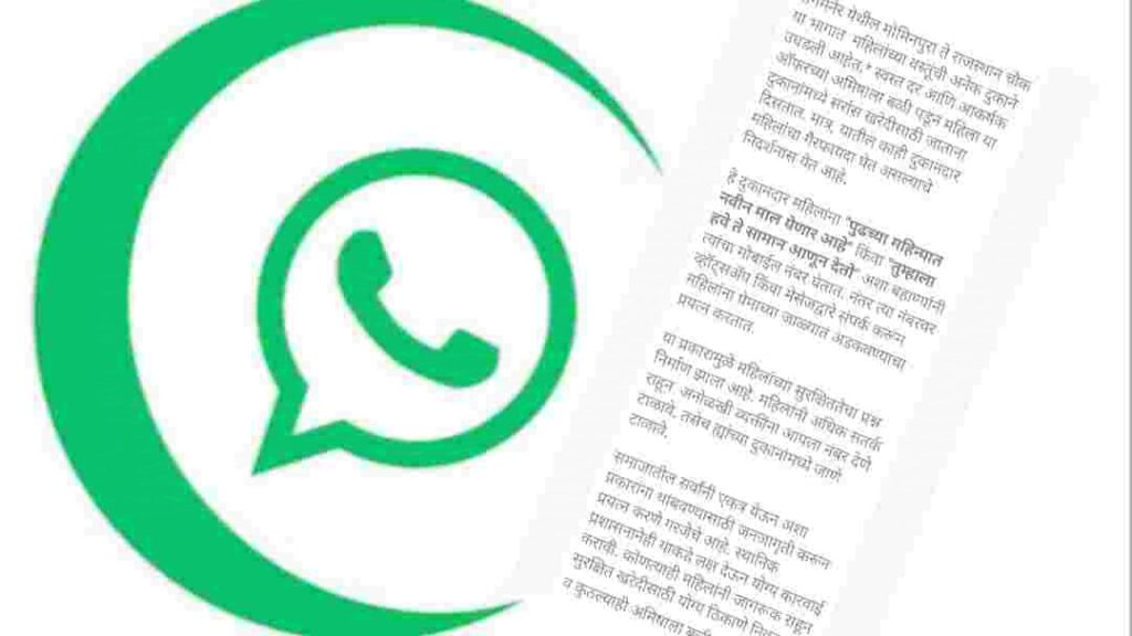 संगमनेर – मोमीनपुरा ते राजस्थान चौक या भागात महिलांच्या वस्तू विक्रीचे दुकाने उघडण्यात आली आहे. या दुकानदारांकडून महिलांचे नंबर घेतले जात असून यामुळे महिलांच्या सुरक्षिततेचा प्रश्न निर्माण झाला आहे. अशा प्रकारचे मेसेज समाज माध्यमात मोठ्या प्रमाणात व्हायरल होत आहे. सोशल मीडियातील अशा मेसेज मुळे सामाजिक स्वास्थ बिघडण्याची चिन्ह निर्माण झाली आहे. या मेसेज मागील सत्य सायबर सेल आणि पोलिसांनी समोर आणण्याची मागणी होत आहे.