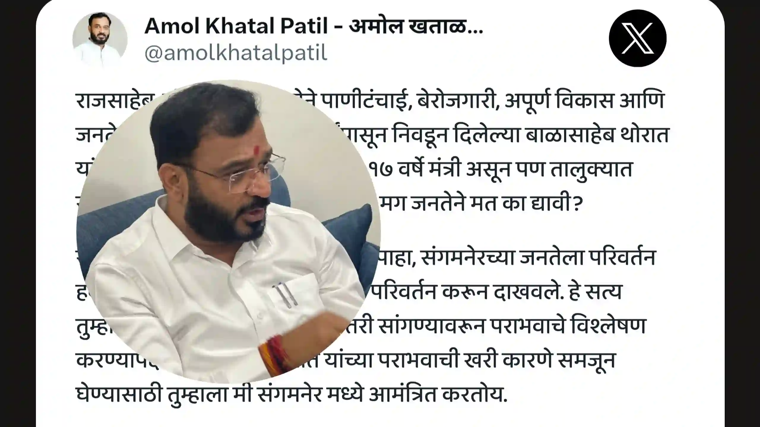 दरम्यान याच विषयावरून दोन दिवसांपूर्वी राज ठाकरे यांनी थेट थोरात यांचे नाव घेत त्यांच्या पराभवाबद्दल शंका उपस्थित केले. आणि केवळ मीच नव्हे तर सारा महाराष्ट्र प्रश्न उपस्थित करत असल्याचे त्यांनी म्हटले होते. त्यानंतर या मतदारसंघातून निवडून आलेले अमोल खताळ यांनी शनिवारी आपल्या एकस अकाउंटवर एक पोस्ट टाकत राज ठाकरे यांना बाळासाहेब थोरात यांच्या पराभवाची खरी कारणे समजून घेण्यासाठी संगमनेरला आमंत्रित करत असल्याचे म्हटले आहे.