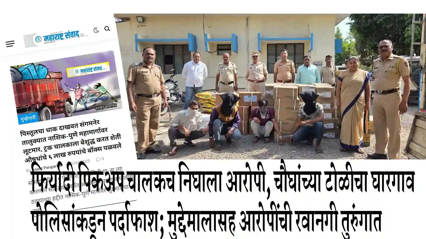असा लावला छडा… पोलीस निरीक्षक दिगंबर भदाणे यांनी या गुन्ह्याचा तपास सहाय्यक पोलीस निरीक्षक कल्पेश दाभाडे यांच्याकडे सोपविला होता. दाभाडे यांनी सर्व घटनाक्रम लक्षात घेत तपासाला सुरुवात केली. हिवरगाव पावसा व चाळकवाडी येथील टोल नाक्यावरील सीसीटीव्ही फुटेज तपासण्यात आले. फिर्यादीच्या मोबाईलचे सीडीआर काढण्यात आले. तांत्रिक विश्लेषणाच्या आधारे दाभाडे व त्यांच्या सहकाऱ्यांनी तपासांती आणखी माहिती मिळवत आरोपी साईदास रघुनाथ गाडेकर (वय २७ वर्ष, रा. रोहकल, चाकण, ता. खेड, जि. पुणे. मुळ रा. निमगाव निघोज, ता. राहाता. जि. अहिल्यानगर) यास ताब्यात घेवन त्याचेकडे तपास केला असता त्याने सदरचा गुन्हा चालक दिपक किसन कदम (वय ४२ वर्षे, रा. वाडा, राजगुरूनगर, ता. खेड, जि. पुणे), तेजस प्रकाश कहाणे (वय २१ वर्षे, रा. वाडा, राजगुरूनगर, ता. खेड, जि. पुणे) व नवनाथ दादाभाऊ शिंदे (वय २८ वर्ष, रा. रोहकल, चाकण, ता. खेड, जि. पुणे) यांचे मदतीने केल्याचे कबूल केले. तसेच त्याचेकडुन गुन्हयातील जबरी चोरी गेलेला माल एम.एच. ४२ एक्यु. ८०७८ यामध्ये लपून ठेवला होता तो देखील ताब्यात घेण्यात आला. पोलिसांनी एकूण १५ लाख १२ हजार २१४ रुपयांचा मुद्देमाल हस्तगत केला असून यामध्ये शेती औषधांसह पीक अप, मोबाईलचा समावेश आहे.