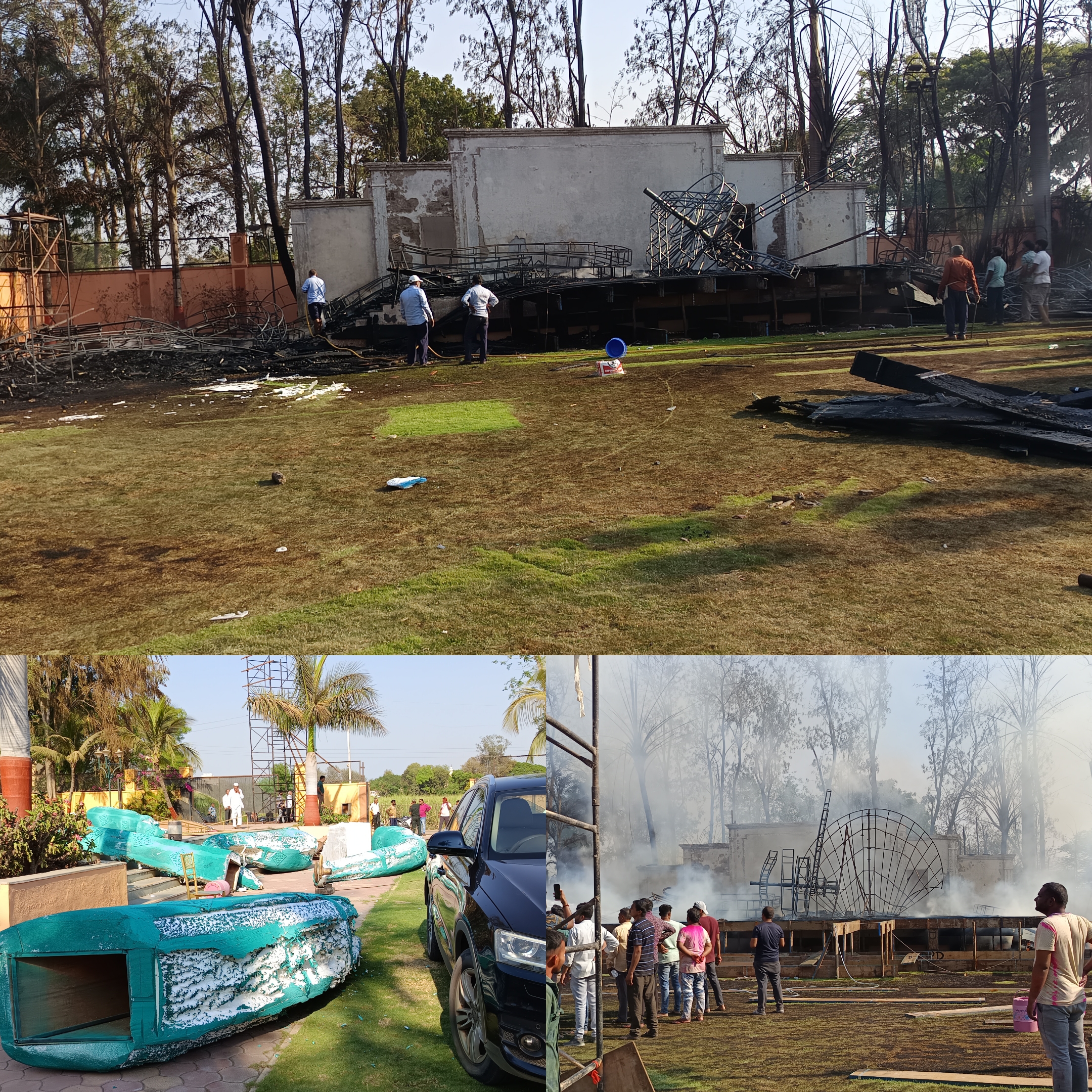 घटनास्थळी अग्निशामक दल, रुग्णवाहिका, नगरपरिषद आणि हजर झाले आहे. आगीचे निश्चित कारण समजू शकले नसले तरी स्टेज उभारण्यासाठी वापरण्यात येणाऱ्या कटरच्या निर्माण झालेल्या ज्वालांमुळे थर्माकोलने पेट घेतल्याने ही घटना घडल्याचा प्राथमिक अंदाज आहे.