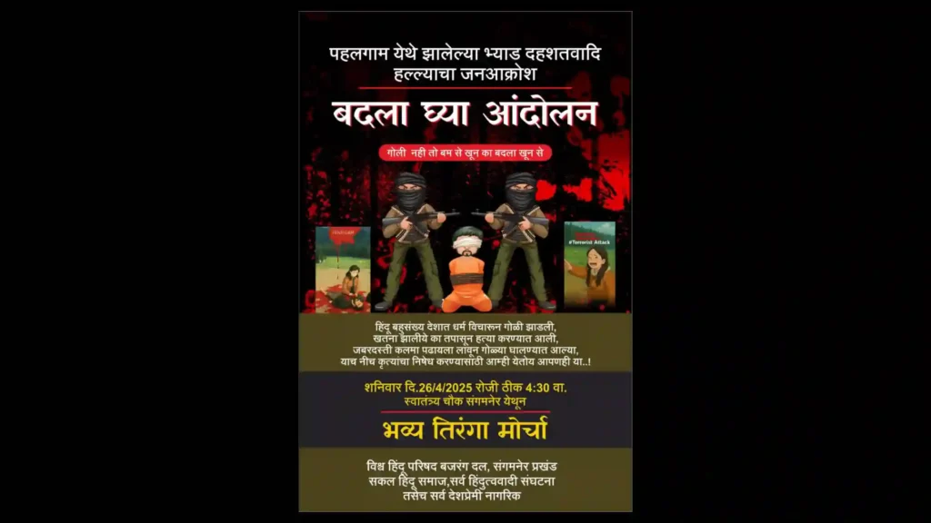 काश्मीर मधील पहलगाम येथे हिंदू पर्यटकांवर झालेल्या जिहादी दहशतवादी हल्ल्याच्या निषेधार्थ संगमनेर शहरात शनिवारी, (२६ एप्रिल) भव्य तिरंगा मोर्चा आयोजित करण्यात आला आहे. विश्व हिंदू परिषद, बजरंग दल आणि सकल हिंदू समाजासह शहरातील सर्व हिंदुत्ववादी संघटनांनी एकत्र येत या संतापजनक घटनेचा तीव्र निषेध नोंदवला आहे.
