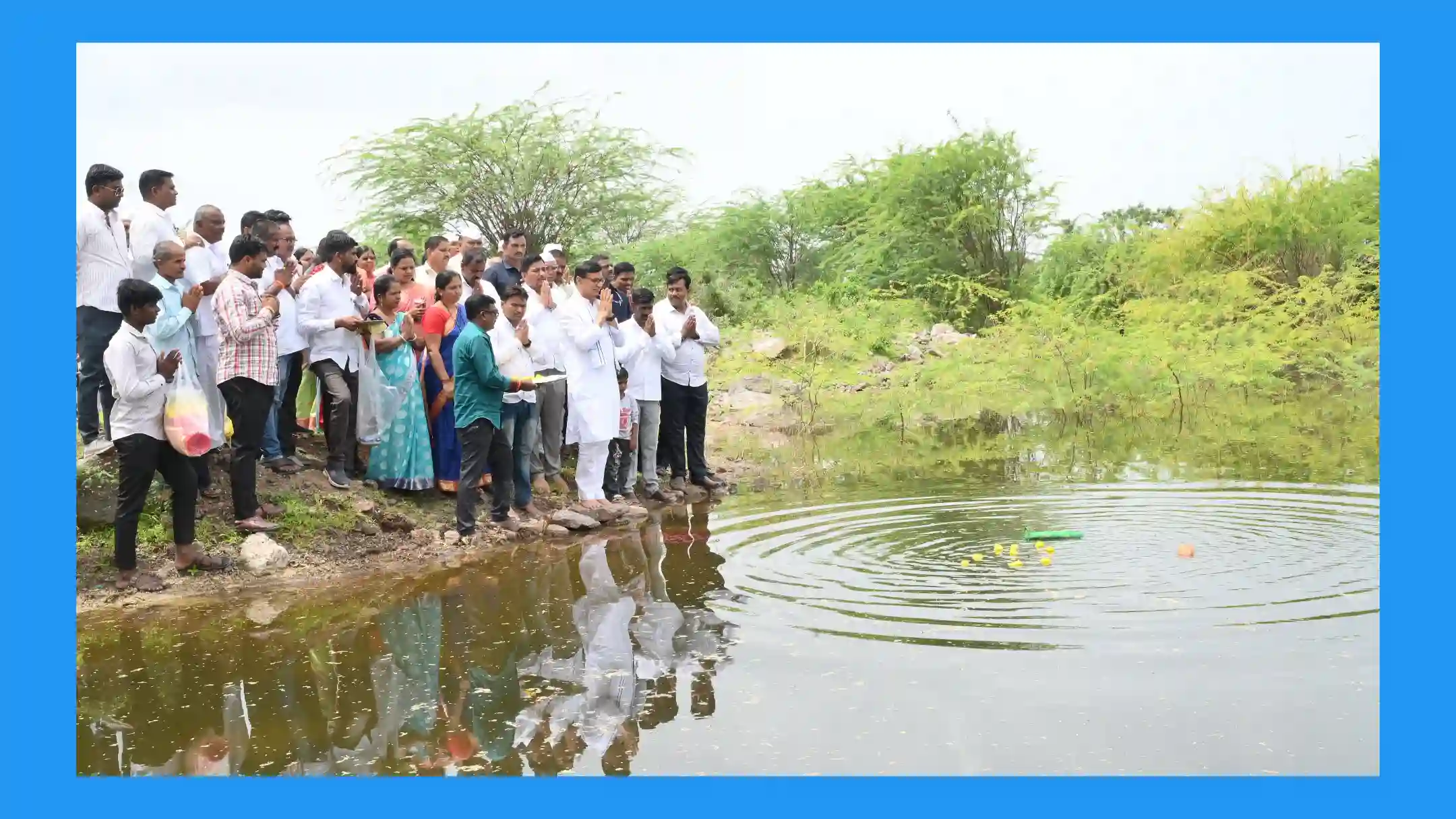 जलपूजन कार्यक्रमादरम्यान गावातील तरुणांनी वाजत गाजत माजीमंत्री बाळासाहेब थोरात यांची भव्य मिरवणूक काढून भेंडाळे बंधारा येथे साडीचोळी अर्पण करून पाण्याचे पूजन केले.