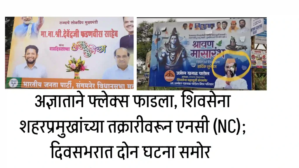 विद्यमान आमदार अमोल खताळ यांच्या शुभेच्छा फलकासह शहरात लावण्यात आलेला माजी खासदार सुजय विखे व मुख्यमंत्री देवेंद्र फडणवीस यांचा फ्लेक्स फाडल्याचा प्रकार समोर आला आहे. शिवसेनेचे शहरप्रमुख विनोद सूर्यवंशी यांच्या तक्रारीवरून याप्रकरणी संगमनेर शहर पोलीस ठाण्यात अज्ञात व्यक्तीविरुद्ध अदखलपात्र (एनसी) गुन्हा दाखल करण्यात आला आहे.