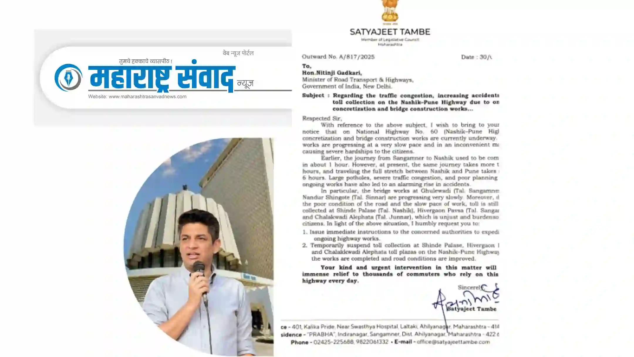 या संपूर्ण परिस्थितीचा गांभीर्याने विचार करून नाशिक–पुणे महामार्गावरील सुरू असलेल्या कामांचा वेग तातडीने वाढवावा आणि कामे पूर्ण होईपर्यंत टोलवसुली थांबवावी अशा दोन महत्त्वपूर्ण मागण्या आमदार सत्यजीत तांबे यांनी आपल्या पत्राद्वारे केंद्रीय मंत्री नितीन गडकरी यांच्याकडे केल्या आहे.