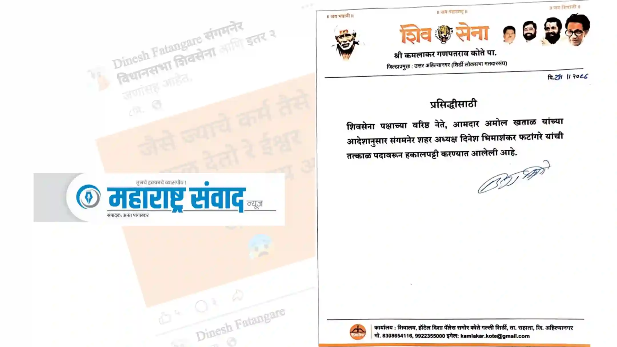 वरिष्ठ नेत्यांच्या आदेशानुसार दिनेश फटांगरे यांची संगमनेर शहर प्रमुख पदावरून तात्काळ हकालपट्टी करण्यात येत आहे.