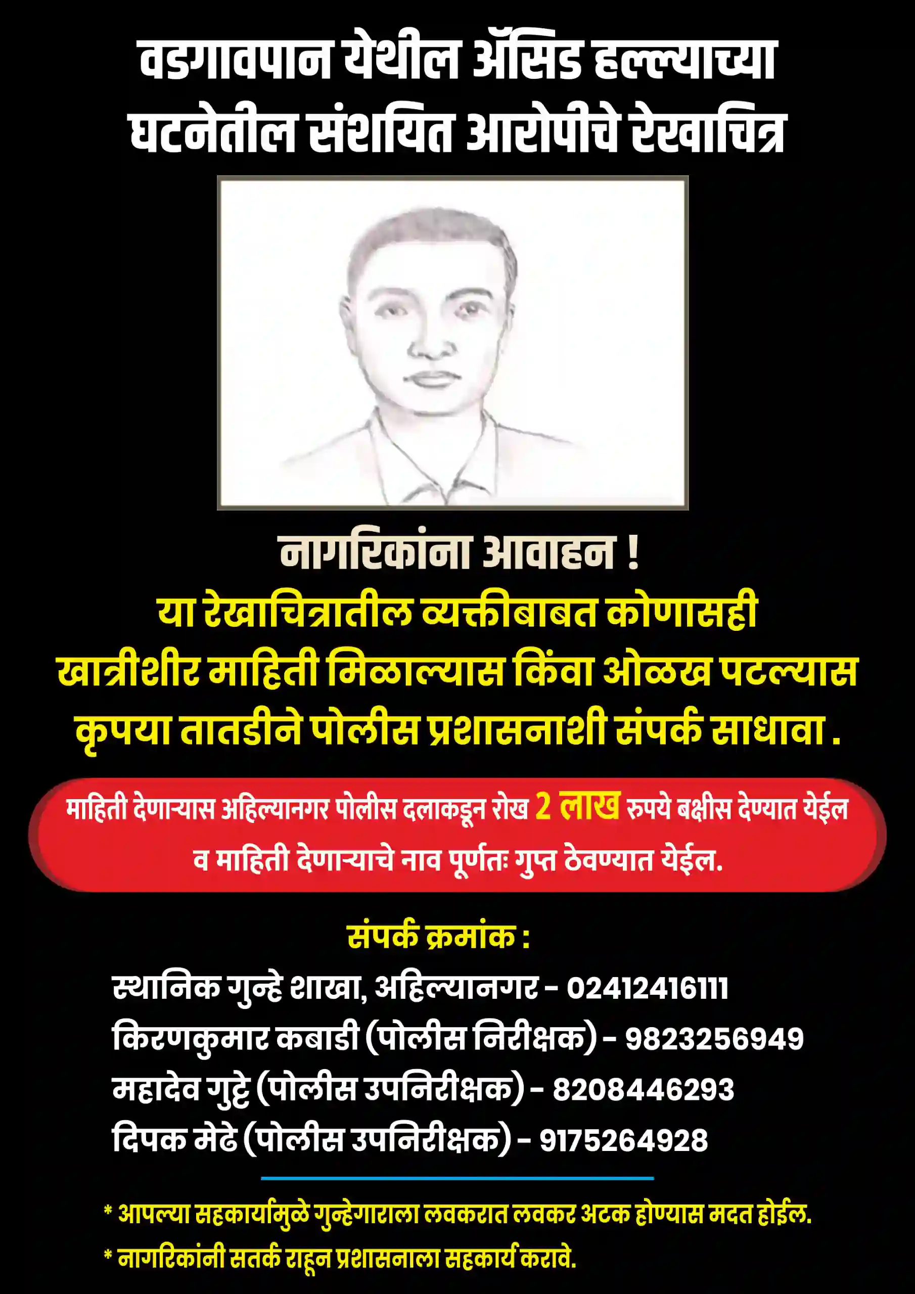 संगमनेर तालुक्यातील कोल्हार-घोटी मार्गावरील वडगाव पान येथे इयत्ता सहावीत शिकणाऱ्या एका अल्पवयीन मुलीवर झालेल्या भीषण ॲसिड हल्ल्याच्या घटनेला आता १५ दिवस उलटून गेले आहेत. मात्र, एवढा काळ लोटूनही पोलीस प्रशासनाला या प्रकरणातील मुख्य आरोपीचा शोध घेण्यात यश आलेले नाही. या धक्कादायक घटनेमुळे संपूर्ण जिल्ह्यात संतापाची लाट असून पोलिसांच्या तपास यंत्रणेसमोर मोठे आव्हान उभे राहिले आहे. या प्रकरणाचे गांभीर्य लक्षात घेऊन आता अहिल्यानगर पोलीस दलाच्या गुन्हे शाखेने आरोपीची ओळख पटवणाऱ्या किंवा माहिती देणाऱ्या व्यक्तीस २ लाख रुपयांचे रोख बक्षीस जाहीर केले आहे.