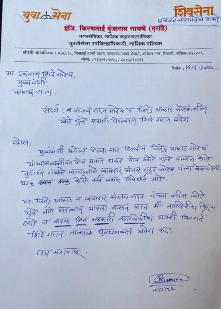 शिवसेना ठाकरे गटाचे प्रवक्ते खासदार आणि सामनाचे कार्यकारी संपादक संजय राऊत राष्ट्रवादी काँग्रेसचे नेते माजी मंत्री आमदार जितेंद्र आव्हाड यांच्यावरील खोटे गुन्हे मागे घेतल्यास मी तीन सहकारी नगरसेविकांसह बिनशर्त शिंदे गटामध्ये प्रवेश करण्यास तयार आहे. अशा आशयाचे पत्र नाशिकच्या शिवसेना उद्धव बाळासाहेब ठाकरे पक्षाच्या माजी नगरसेविका किरण गामणे यांनी मुख्यमंत्री एकनाथ शिंदे यांना पाठविले आहे.