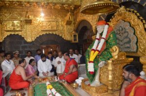 मुख्यमंत्र्यांच्या साई दर्शनावेळी विभागीय आयुक्त राधाकृष्ण गमे, विशेष पोलीस महानिरीक्षक बी. जी.शेखर पाटील, जिल्हाधिकारी डॉ. राजेंद्र भोसले, जिल्हा पोलीस अधीक्षक राकेश ओला, मुख्य कार्यकारी अधिकारी आशिष येरेकर, शिर्डी संस्थानचे उप मुख्य कार्यकारी अधिकारी राहूल जाधव, प्रांताधिकारी गोविंद शिंदे उपस्थित होते.