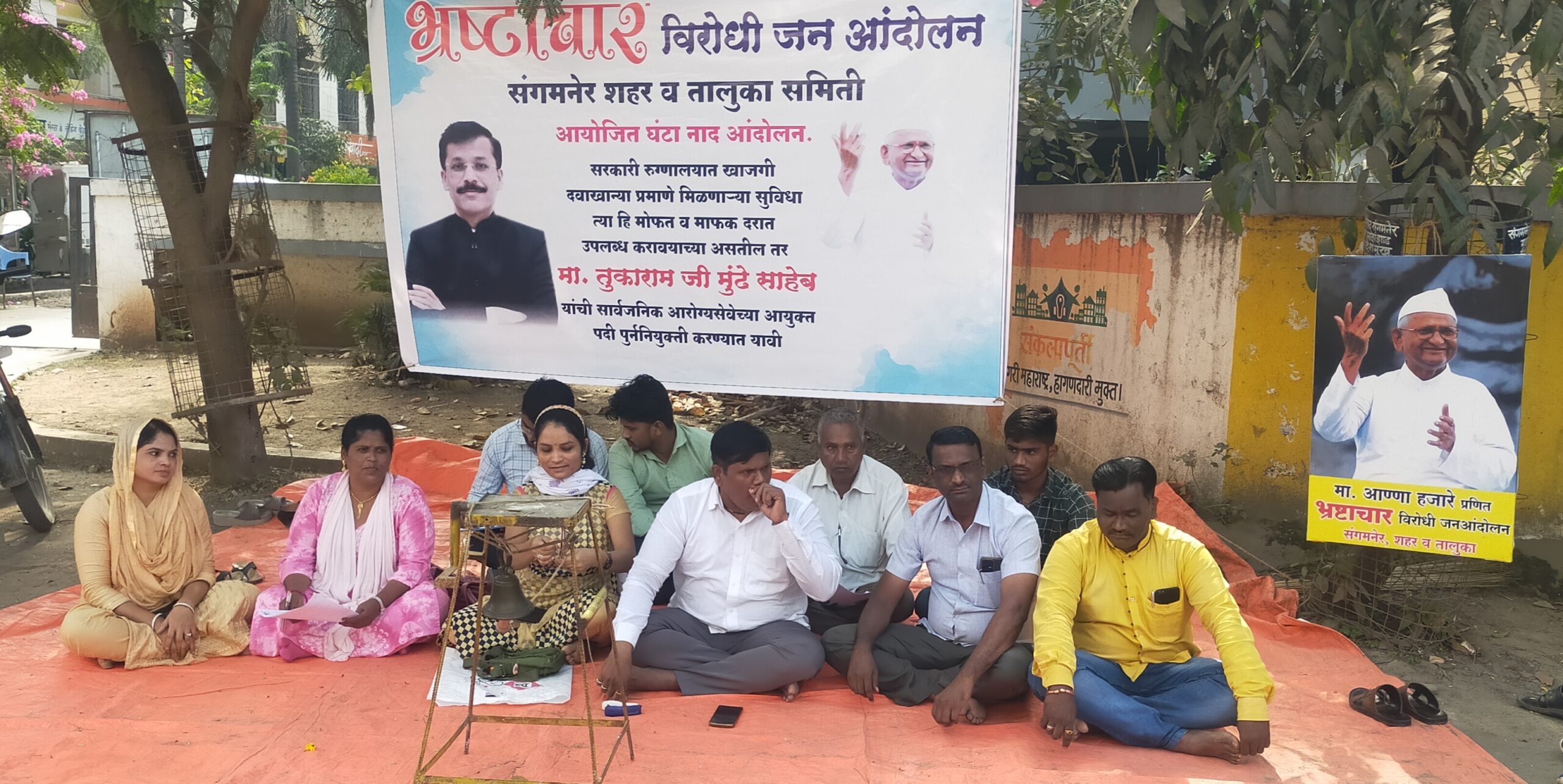 त्यामुळे राज्य शासनाने कोणत्याही दबावाला बळी न पडता मुंढे यांची पुन्हा आरोग्य आयुक्त पदावर नियुक्ती करण्याची मागणी करण्यात आली आहे. या मागणीसाठी सुरू केलेल्या घंटानात आंदोलनामध्ये अण्णा हजारे प्रणित भ्रष्टाचार विरोधी जन आंदोलनाचे शहर अध्यक्ष सचिन साळुंखे, तालुकाध्यक्ष संजय देशमुख, उपाध्यक्ष आप्पा गुंजाळ, तालुका सचिव असिफ शेख, तालुका सहसचिव अनिल खर्डे, संतोष जेधे, महिला आघाडीच्या फर्जना शेख, दीपक साळुंखे, दत्ता चव्हाण आदींसह संघटनेचे पदाधिकारी, कार्यकर्ते सहभागी झाले होते.