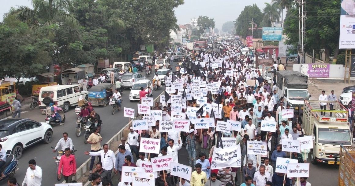 राज्यातील शिंदे-फडणवीस सरकार आणि महसूल मंत्री राधाकृष्ण विखे यांनी गौण खनिजासंबंधी घेतलेल्या धोरणामुळे बांधकाम व्यवसायाशी निगडित कामे ठप्प झाली असून या क्षेत्राशी निगडित असलेल्या हजारो कामगारांवर उपासमारीची वेळ आली आहे. या पार्श्वभूमीवर माजी महसूल मंत्री बाळासाहेब थोरात यांच्या संगमनेरमध्ये बांधकाम व्यवसायाशी निगडित असलेल्या हजारो रोजंदारी पुरुष व महिला कामगार व त्यांना रोजंदारी देणारे व्यावसायिक शनिवारी महाआक्रोश मोर्चाच्या माध्यमातून रस्त्यावर उतरले होते. विशेष म्हणजे या मोर्चाला या व्यवसायाशी निगडित राजकीय पदाधिकारी वगळता अन्य राजकीय नेत्यांची अनुपस्थिती होती.