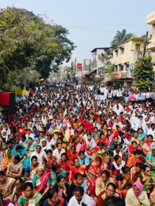 मालपाणी लॉन्स पासून सकाळी दहा वाजता या मोर्चाला सुरुवात झाली. मोर्चा प्रांताधिकारी कार्यालयासमोर आल्यानंतर त्याचे भव्य सभेत रूपांतर झाले. खोके सरकार, बोके सरकार आणि महसूल मंत्री यांच्या विरोधातील घोषणांनी हा परिसर दणाणून गेला होता. रोजंदारी पळविणाऱ्या सरकारवर टीका करणाऱ्या वक्त्यांमध्ये महिलांचादेखील समावेश होता.