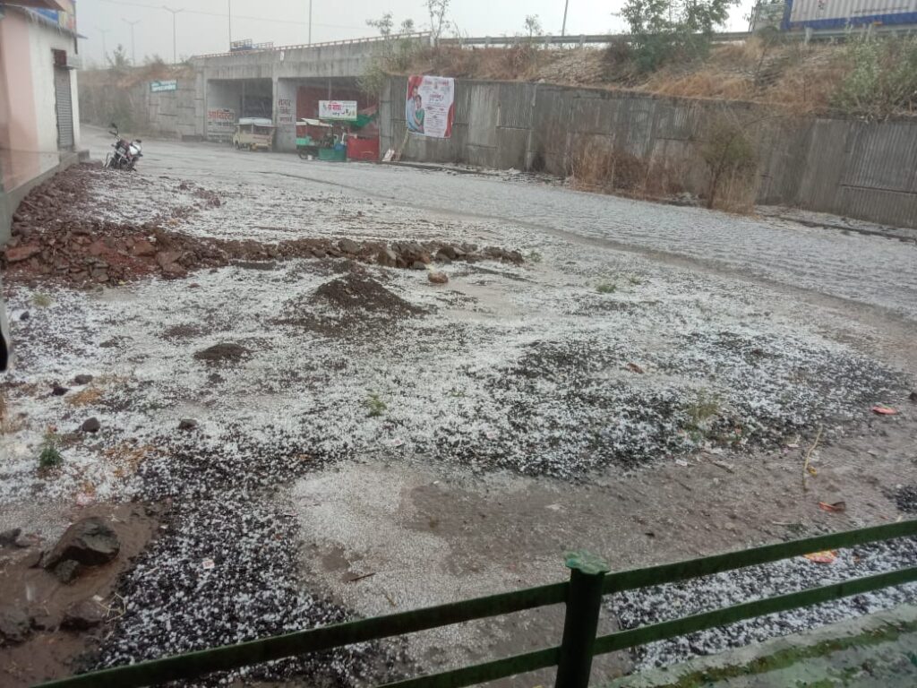 दुपारी दोन वाजण्याच्या सुमारास अचानक या भागात वादळी वाऱ्यासह पावसाला सुरुवात झाली. त्यानंतर अचानक पावसाबरोबर गाराही पडू लागल्या. या गारा इतक्या मोठ्या प्रमाणावर पडल्या की काही काळ महामार्गावर स्नो फॉल झाल्यानंतर रस्त्यावर जसे बर्फ असते तसेच स्वरूप आले होते.