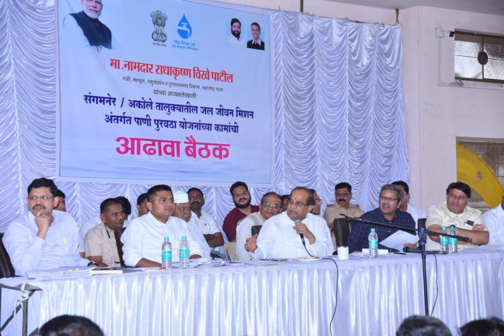 जलजीवन मिशन अंतर्गत महाराष्ट्र जीवन प्राधिकरण आणि जिल्हा परिषदेच्या माध्यमातून संगमनेर-अकोले तालुक्यातील सुरू असलेल्या योजनांचा आढावा घेण्यासाठी मंत्री विखे पाटील यांच्या उपस्थितीत बैठकीचे आयोजन करण्यात आले होते. जिल्हाधिकारी सिध्दराम सालीमठ, जिल्हा परिषदेचे मुख्य कार्यकारी अधिकारी आशिष येरेकर, पाणी पुरवठा विभाग आणि जिल्हा परीषदेच्या कार्यकारी अभियंत्यांसह तहसिलदार, गटविकास अधिकारी, माजी आमदार वैभव पिचड याप्रसंगी उपस्थित होते.