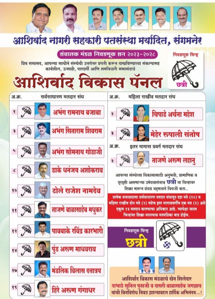 संगमनेर (महाराष्ट्र संवाद न्यूज) – रविवारी झालेल्या आशीर्वाद नागरी सहकारी पतसंस्थेच्या निवडणुकीत सत्ताधारी आशीर्वाद विकास पॅनलचे सर्वच्या सर्व उमेदवार मोठ्या मताधिक्याने विजयी झाले आहे. सभासदांनी पुन्हा एकदा सत्ताधाऱ्यांवर विश्वास दर्शवित विरोधी पॅनलचा मोठ्या मताधिक्याने पराभव केला.