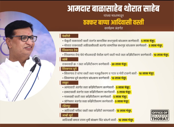 सन २०२३-२०२४ या आर्थिक वर्षासाठी ठक्कर बाप्पा आदिवासी वस्ती योजनेअंतर्गत संगमनेर तालुक्यातील पेमगिरी येथे येळुशी ठाकरवाडी वस्ती अंतर्गत सामाजिक सभागृहाचे बांधकाम करणेसाठी ५ लाख, मोरदरा ठाकरवाडी आदिवासीवस्ती अंतर्गत सामाजिक सभागृह बांधकाम करणेसाठी ५ लाख असा एकूण १० लाखांचा निधी, पिंपळगाव देपा गावासाठी पिंपळगांव देपा येथे मोंधळवाडी येथील घाणे वस्तीमध्ये रस्ता क्रॉक्रेटीकरण करणेसाठी १० लाखांचा निधी मिळाला आहे.