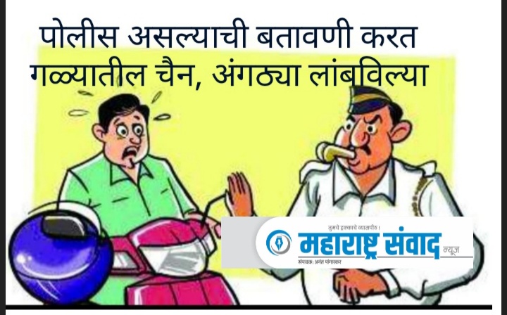 दुचाकीवरील या दोघांपैकी एकाने त्यांना पोलीस असल्याचे कार्ड दाखवत, पुढे शिंदे साहेब उभे आहेत, तुम्ही अंगावर एवढे सोने घालून जाऊ नका नाहीतर साहेब आम्हाला खूप बोलतील असे सांगत एक कागद काढला व धुमाळ यांना अंगावरील सर्व दागिने काढून त्यात ठेवण्यास सांगितले. त्यांच्या सांगण्याप्रमाणे धुमाळ यांनी गळ्यातील सोन्याची चैन, हातातील सोन्याच्या चार अंगठ्या व एक चांदीची अंगठी काढून त्या कागदात ठेवली. त्यानंतर त्याने त्या कागदाची पुढील करत ती पुडी धुमाळ यांच्या हातात न देता त्यांना गाडीची डिक्की उघडण्यास सांगितले.