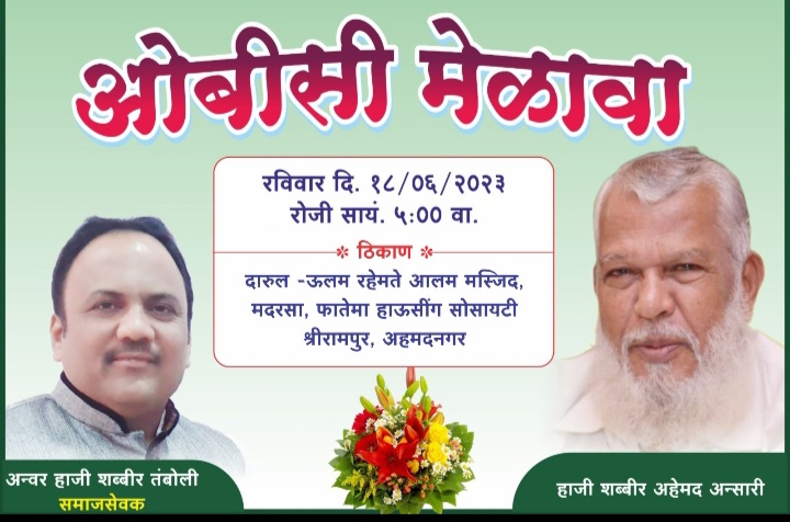 मुस्लिम ओबीसी समाजाचा अहमदनगर जिल्हा मेळावा ऑल इंडिया ओबीसी अध्यक्ष हाजी शब्बीरभाई अहेमद अन्सारी यांचे अध्यक्षतेखाली व नाशिक जिल्हा अध्यक्ष तनवीर तांबोळी, संगमनेर येथील शफीभाई तांबोळी यांचे प्रमुख उपस्थितीत होत आहे.